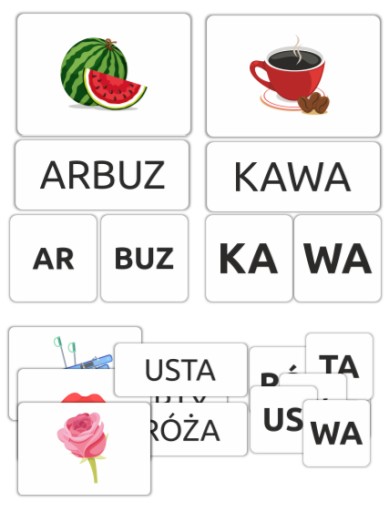Poprawnie ułożone sylaby utworzą dany wyraz, który trzeba dopasować do odpowiedniego obrazka i karty z pełnym wyrazem.