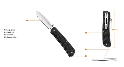 Przedstawiamy Państwu wielofunkcyjny scyzoryk RUIKE LD11-B. Ten wielofunkcyjny scyzoryk został wykonany ze stali nierdzewnej Sandvik 12C27, dzięki czemu mamy pewność, ze scyzoryk długo będzie trzymał ostrość. Okładziny noża zostały wykonane z G10, teksturowania powierzchnia gwarantuje użytkownikowi pewnych chwyt, nawet w mokrych lub wilgotncyh rękach. Za bezpieczeństwo użytkowania odpowiada pewna blokada ostrza liner-lock. Dzięki jednostronnemu klipsowi, nóż możemy przypiąć zarówno do paska, jak i do krawędzi kieszeni. Scyzoryk został wyposażony na końcu rękojeści w zbijak do szyb, dzięki czemu może służyć jako narzędzie ratownicze. Producent w rękojeści noża umieścił również pincetę.