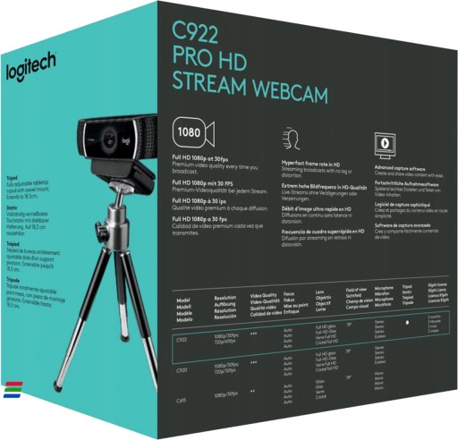 Dostarczane w zestawie: kamera C922 z kablem USB, statyw stołowy, dokumentacja, trzymiesięczna licencja XSplit Premium