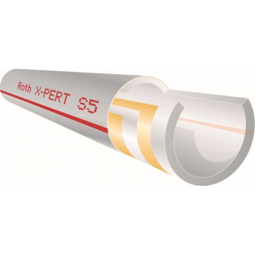 Rura X-PERT S5 + zawdzięcza metodzie wytwarzania, polegającej na jedno-czesnym wytłaczaniu wszystkich warstw rury (metoda koekstruzji). Ten sposób produkcji sprawia, iż w polietylenie zachodzi proces zagęszczania struktury molekularnej, przez co następuje polepszenie jakości otrzymanego tworzywa. Rura Roth X-PERT S5 + znajduje zastosowanie zarówno w montażu ogrzewania podłogo-wego, jak i instalacji grzejnikowych. Składa się z rury bazowej z PERT otoczonej warstwą antydyfuzyjną EVOH, a następnie warstwą ochronną również z PERT. Pomiędzy poszczególnymi płaszczyznami występuje spoiwo dodatkowo wzmacniające konstrukcję rury.