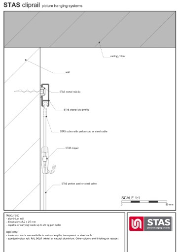 Cliprail to szyna o wytrzymałości do 20 kg na metr bieżący systemu zawieszania. Ta dyskretna i elegancka szyna nadaje się do każdego typu pomieszczeń. Szyna Cliprail oferowana jest w trzech kolorach: białym, czarnym i w kolorze naturalnego aluminium. Szynę łatwo przymocować do ściany za pomocą specjalnych klipsów dostarczanych w komplecie z szyną.
