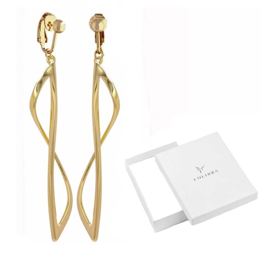 Złote klipsy długie firmy Colibra, wykonane ze stopu jubilerskiego trwale pozłacanego 24 karatowym złotem, zgodnie z najwyższą sztuką złotniczą oraz dbałością o detale, posiadają oryginalne metki firmowe.