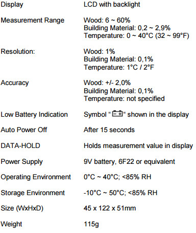 Urządzenie jest wyposażone w wyświetlacz LCD, który wyświetla wartości pomiaru wilgoci i temperatury badanego materiału.