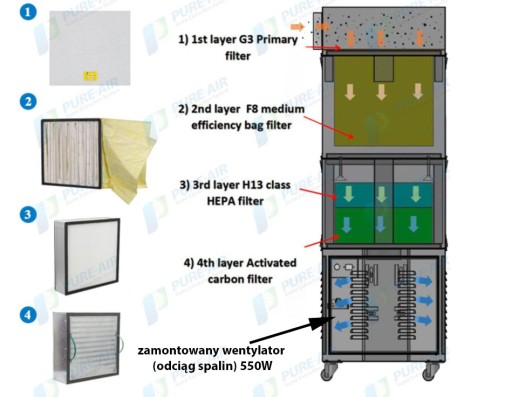 Pochłaniacz wraz z zamontowanym w środku wentylatorem absorbują wszelakie spaliny, opary, kurze powstające w wyniku cięcia z maszyn przemysłowych takich jak plotery laserowe, spawarki itp.