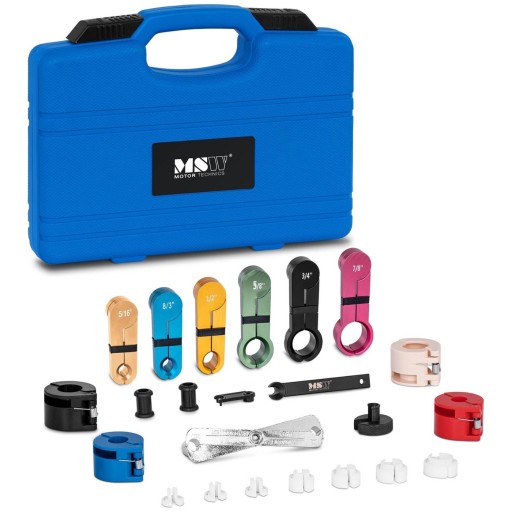 Praktyczny zestaw do złącz paliwowych i klimatyzacji marki MSW zaprojektowano do użytku profesjonalnego w warsztatach i serwisach samochodowych. Model MSW-ARC-11 pasuje do szerokiej gamy pojazdów. Dzięki kodowaniu kolorami różnych rozmiarów obsługa przebiega błyskawicznie.