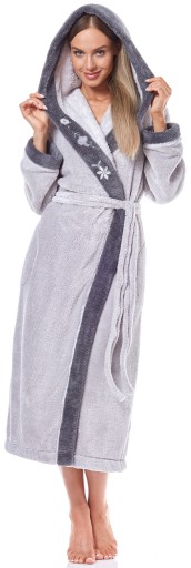 Długi szlafrok w stonowanych kolorach z kapturem, z kontrastową lamówką i pięknym haftem.