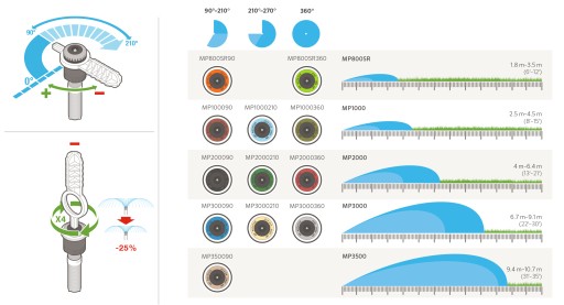 MP Rotator zapewnia zwiększony zasięg w porównaniu do tradycyjnych zraszaczy, z odpowiednio dostosowanym opadem przy dowolnie ustawionym kącie i zasięgu. Wolniejsze tempo nawadniania wymaga dwukrotnie większego czasu pracy w stosunku do tradycyjnych zraszaczy, znacznie ograniczając zjawisko spływania wody – jest to idealne rozwiązanie w przypadku zboczy i zwięzłych gleb. Zwiększona wydajność oznacza o 30% mniejsze zużycie wody w porównaniu do tradycyjnych zraszaczy.