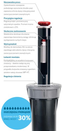 MP Rotator jest rewolucyjną, wielostrumieniowa dyszą obrotową zapewniającą bardziej równomierne nawodnienie powierzchni. MP Rotator nie przyczynia się do powstawania mgły towarzyszącej dużemu ciśnieniu wody, tylko stałym, wolnym tempem pokrywa powierzchnię wielokrotnym strumieniem wody. Wolniejsze tempo nawadniania powoduje, że woda równomiernie wsiąka w całą nawadnianą powierzchnię. Zwiększona wydajność pozwala zaoszczędzić do 30% wody w porównaniu do tradycyjnych zraszaczy i znacznie ogranicza stratę wody spowodowaną spływaniem wody na pochyłych terenach. MP Rotator można zainstalować na dowolnym korpusie konwencjonalnego zraszacza lub adapterze do krzewów, przekształcając go w równomiernie rozprowadzające wodę zraszacz. Nawadnianie może być przeprowadzane pod dowolnym kątem i o dowolnym promieniu.