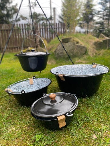Nasze kociołki importujemy z Węgier, gdzie są produkowane przez Węgrów w zakładach o wieloletniej tradycji. Z racji rzemieślniczego wyrobu, kociołkom zdarza się mieć (często nieuniknione) odpryski emalii przy uchwycie. Dla estetów polecamy kociołki ze stali nierdzewnej, również dostępne na naszych aukcjach.