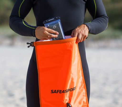 - Bojka MasterSwimmer posiada dużą szczelną kieszeń umożliwiającą schowanie do niej portfela, telefonu, kluczyków, ubrania, butów i ręcznika. Jest to największy model dmuchanych bojek dostępny na rynku, oferuje zatem największą ilość miejsca w suchej kieszeni transportowej!!!