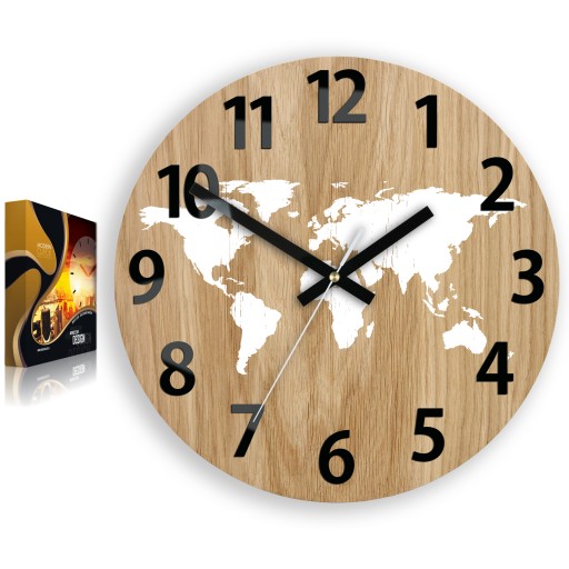 Zegar ścienny Dębowy WORLD z motywem mapy świata - jest masywny i mocny, wykonany z dbałością o każdy szczegół. Posiada czytelną tarczę z wyraźnymi czarnymi cyframi. Zegar swoim wyglądem nawiązuje do stylu skandynawskiego - wnętrza naturalne i jasne. Został został wyposażony w Ultra Cichy mechanizm. Zegar został także zapakowany w eleganckie pudełko idealnie nadające się na prezent.