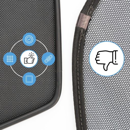 Zasłony RayStop® - to sztywna konstrukcja, wykonana z wytrzymałego drutu ocynkowanego o grubości 4 mm, z gumowaną powłoką “Premium” i mocno naciągniętą siatką (100% poliester), które są wykonane indywidualnie dla Twojego samochodu.