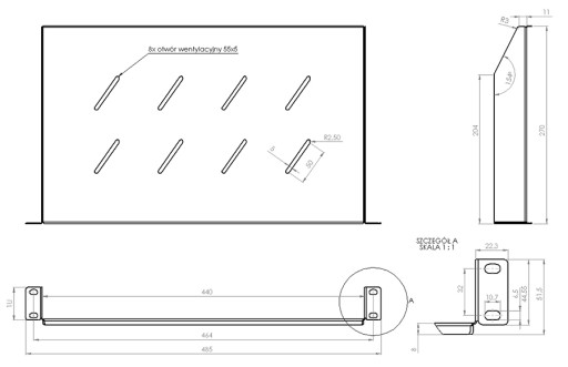 - Wymiary zewnętrzne: 485 x 51,5 x 270 mm