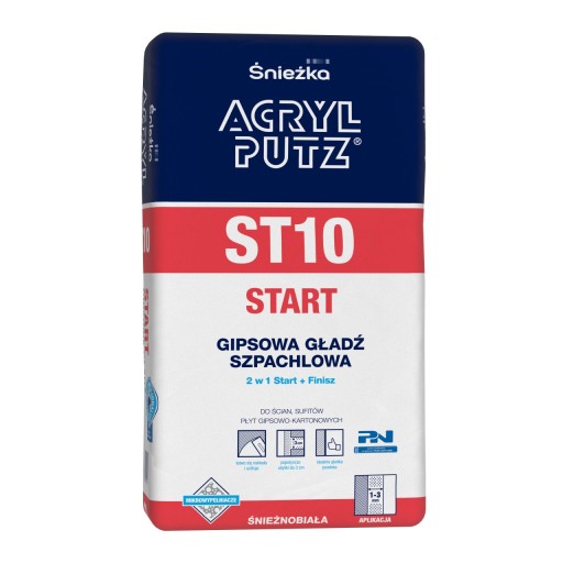 Gładź szpachlowa do zastosowania na ściany i sufity - po jej zastosowaniu uzyskujemy śnieżnobiałą, idealnie gładką i łatwą do malowania powierzchnię. Charakteryzuje się świetną przyczepnością do podłoża. ST10 jest polecane do prac wewnątrz pomieszczeń a dzięki udoskonalonej formule można stosować ją jako warstwę wierzchnią, bez konieczności używania gotowych gładzi szpachlowych.