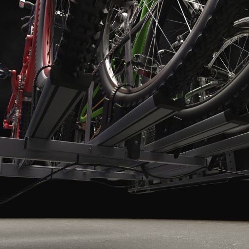 - Platformę można zabezpieczyć przed kradzieżą, zamykając na kluczyk pokrętło w miejscu mocowania do kuli haka, a indywidualne gałki z zamkami zabezpieczają zamocowane na platformie rowery