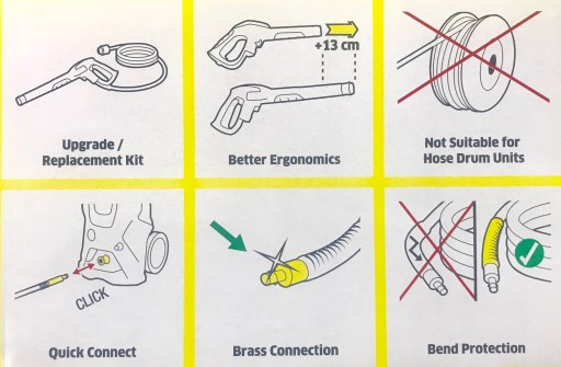 Umożliwia łatwe podłączanie węża wysokociśnieniowego do pistoletu i do urządzenia oraz odłączanie poprzez proste naciśnięcie przycisku na pistolecie.