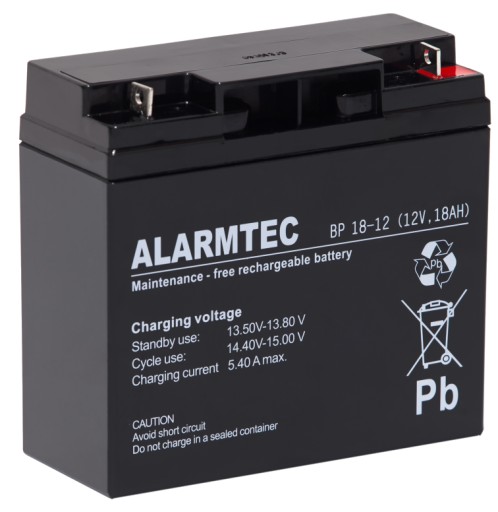 Akumulator bezobsługowy Alarmtec BP 18Ah 12V to bezobsługowy akumulator VRLA (Valve Regulated Lead Acid, czyli z samoregulującymi zaworami bezpieczeństwa i wewnętrzną rekombinacją gazów) z elektrolitem uwięzionym w separatorze z maty szklanej AGM (ang. Absorbent Glass Mat), potocznie żelowy. Dedykowany jest do zasilaczy buforowych stosowanych w systemach alarmowych, CCTV, SSWiN, kontroli dostępu, systemów przeciwpożarowych (zasilanie awaryjne), kas fiskalnych, central telefonicznych, oświetlenia awaryjnego, automatyki itp.