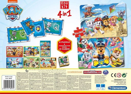 Zestaw edukacyjny Psi Patrol 4w1. Wspaniała zabawa dla najmłodszych z postaciami z jednej z najpopularniejszych kreskówek ostatnich czasów. Zestaw składa się z czterech zabaw - puzzli, kart memo, kostek do układania obrazków i domina. Zabawa rozwija u maluchów pamięć, logiczne myślenie, zdolności manualne i spostrzegawczość.