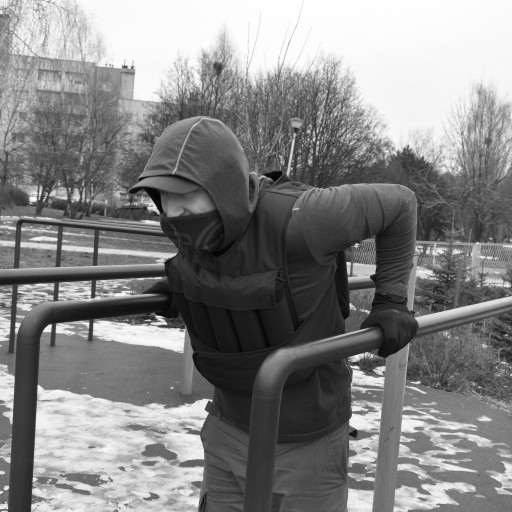 Posiada 10 obciążników po 1 kg każdy, 5 sztuk na plecach i 5 sztuk na klatce piersiowej.
