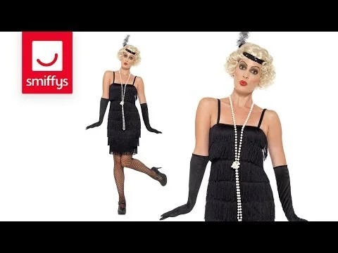Strój Flapper Przebranie Gangsterki dla dorosłych Kostium Lata 20. Elegancka sukienka przed kolano ozdobiona frędzlami w kolorze czerni to przepustka do szalonej zabawy lat 20 i 30-tych ubiegłego wieku. Do kompletu dobierz pierzasty szal i daj się porwać imprezie w stylu Jay'a Gatsby'ego.