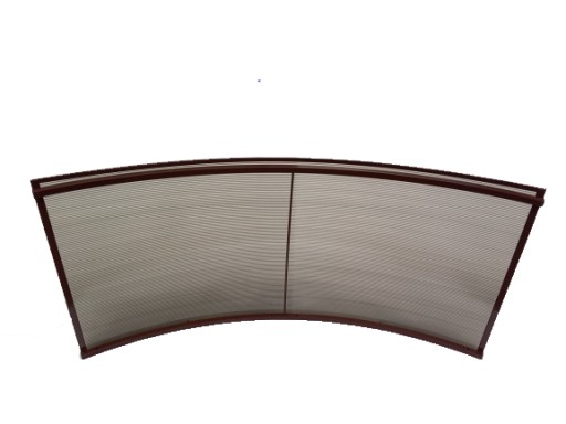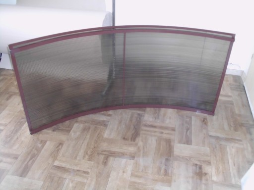 profili aluminiowych pomalowanych proszkowo na kolor brązowy(8017) pokryte płytą poliwęglanową jednokomorową z filtrem UV co zapobiega żółknięciu płyta koloru dymnego (brąz) z rynienkami przód zadaszenia wykończony ceówką w kolorze