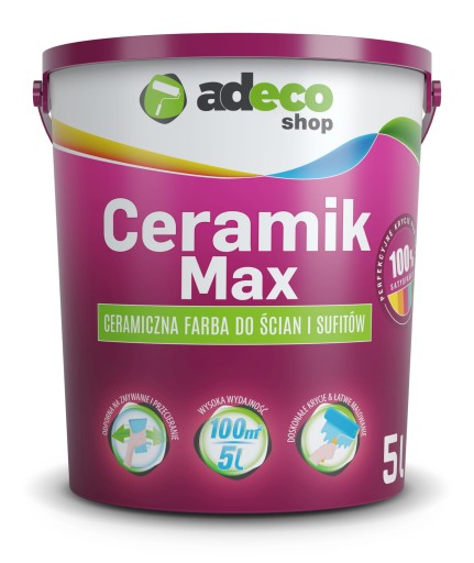 Wodorozcieńczalna, matowa farba przeznaczona do wymalowań wnętrz wszędzie tam gdzie wymagane jest zachowanie wysokiej estetyki oraz długotrwałych i wytrzymałych pokryć dekoracyjno-ochronnych, na typowe podłoża budowlane jak nowe tynki cementowe, bądź pokryte wcześniej farbami na bazie tworzyw sztucznych, płyt gipsowo kartonowych, tapet. Stosowana do pomieszczeń mieszkalnych i w budynkach użyteczności publicznej (szkoły, przedszkola, ośrodki zdrowia, szpitale, obiekty spożywcze bez kontaktu z żywnością, obiekty sakralne, rekreacyjne i hotelowe) szczególnie narażonych na zabrudzenia oraz powierzchni, które wymagają dezynfekcji np. ciągi komunikacyjne, korytarze, pomieszczenia prywatne, biurowe, służb medycznych. Produkt dostępny jest w kolorze białym lub w kolorach zgodnie ze wzornikiem adeco.shop. Tworzy elastyczną plamoodporną i wodoodporną powłokę, w 1 klasie odporności na szorowanie na mokro wg PN-EN 13300:2002. Dzięki niskiej zawartości LZO farba Ceramik Max jest przyjazna dla alergików jak również doskonale wpisuje się w założenia eco-friendly oraz zero waste marki adeco.shop