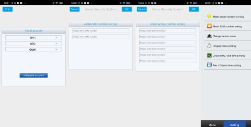 Aplikacja oprócz standardowych poleceń: Uzbrojenie i Rozbrojenie pomaga ustawić numery telefonów na które będą przychodzić rozmowy i smsy alarmowe.