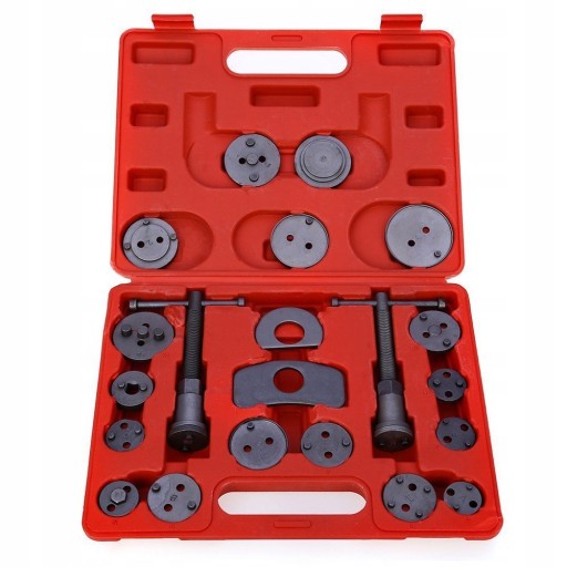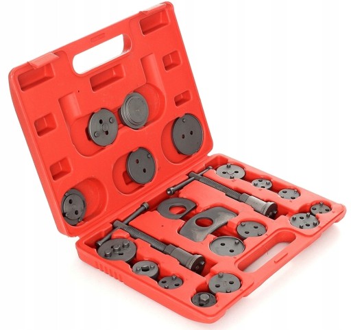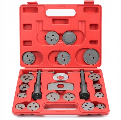 W zestawie znajdują się dwie prasy (prawo i lewo skrętna), dwie różnego kształtu belki do zapierania prasy o siodło zacisku oraz 17 adapterów dostosowanych do wielkości tłoczków hamulcowych stosowanych w większości samochodów osobowych produkowanych na europejskim oraz azjatyckim rynku. Zestaw wykonany z najwyższej wysokiej jakości stali, zapakowany w solidną plastikową wstrząsoodporna, i bardzo wygodna w noszeniu walizkę Pokrętło wyposażone w magnetyczną końcówkę utrzymującą każdy adapter Doskonale sprawdza się przy pracy z tłoczkami ceramicznymi.