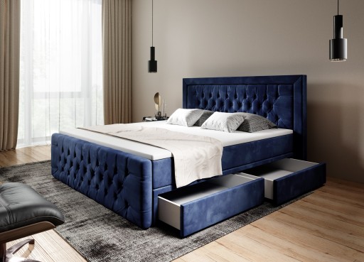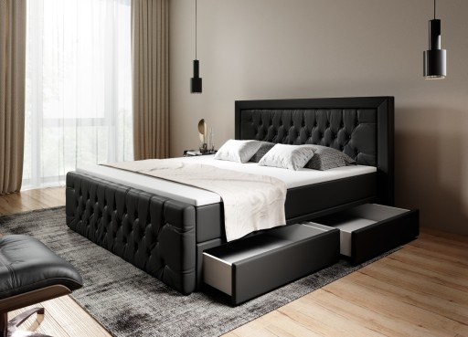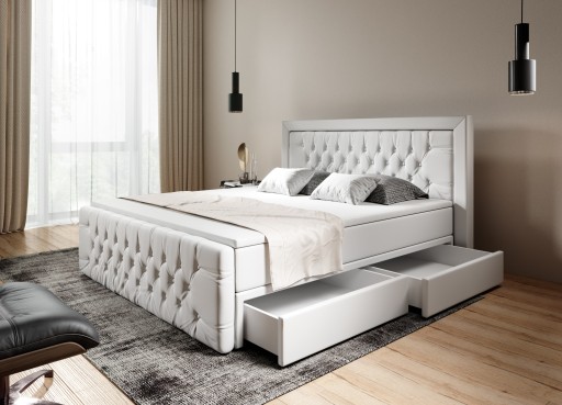 Kompletne łóżko składa się z Zagłowia oraz Zanóżka z ozdobnym pikowaniem Chesterfield. Podstawa łóżka składa się z dwóch wysokich materaców na sprężynie kieszeniowej oraz dodatkowego materaca nawierzchniowego (toppera).