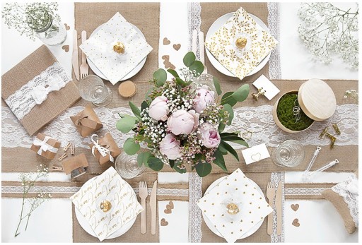 Wyjątkowo elegancki bieżnik na stół zdobiony delikatną białą koronka na środku. Jutowy bieżnik to idealna dekoracja stołu na Chrzest Święty w rustykalnym stylu. Pięknie prezentuje się z dekoracjami i dodatkami z kolekcji Anioł Stróż.