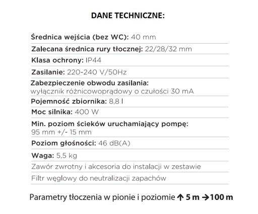 - przepompowywuje ścieki na wysokość 5 m i odległość do 100 m.
