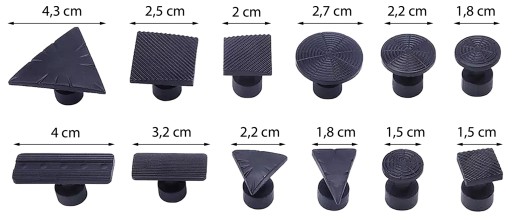 - Adaptery w różnych rozmiarach i kształtach dają możliwość dopasowania ich do miejsca wgniecenia.