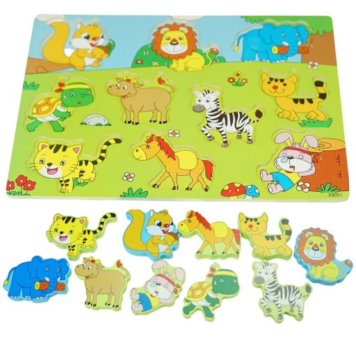 Nauka przez zabawę! Drewniana kolorowa układanka puzzle ZWIERZĄTKA to doskonała zabawka edukacyjna, która kształtuje manualne zdolności dziecka.