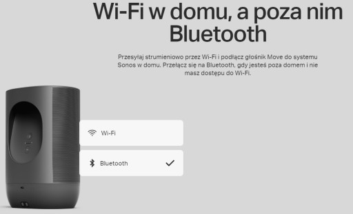 Ciesz się doskonałym dźwiękiem gdzie zechcesz dzięki odpornemu na warunki atmosferyczne i upadki Move. Steruj nim za pomocą głosu, aplikacji Sonos i Apple AirPlay 2 w domu, a kiedy sieć Wi-Fi nie jest dostępna, przesyłaj treści strumieniowo przez Bluetooth.