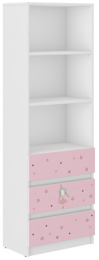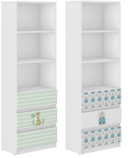 Nowoczesny regał B-3 to praktyczny i funkcjonalny mebel, który znajdzie swoje zastosowanie w każdym pokoju dziecięcym. Ergonomiczne wymiary zapewniają swobodne umeblowanie pomieszczenia. Regał wykonany jest z płyty wiórowej kolor biały, wykończony okleiną. W dolnej części regału znajdują się trzy zamykane szuflady, a w górnej części dodatkowe półeczki. Drzwi szuflad posiadają kolorowy nadruk, który ma ładne żywe kolory i jest zabezpieczony specjalnym laminatem aby nie uległ wyblaknięciu lub ścieraniu. Można bez obaw myć go ściereczką i płynem.