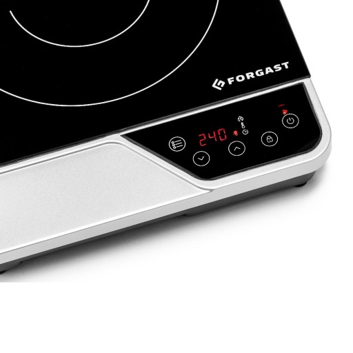 Kuchenka indukcyjna marki Forgast o mocy 2 kW. Powierzchnia gotująca kuchenki wykonana ze szkła, obudowa - z tworzywa sztucznego.