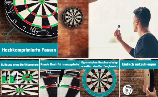 - Doskonały design – ta tarcza do darta ma oficjalne turniejowe wymiary i tym samym mierzy 45 cm średnicy i 3,8 cm głębokości. Cienka, okrągła krawędź i bezzaciskowy bulaj sprawiają, że szansę odbicia zwiększają potencjał trafności. Rzutki do darta fantastycznie wsuwają się do szyby. Dzięki obrotowemu pierścieniowi z liczbami liczby można obracać niezależnie od tarczy i w ten sposób znacznie wydłużyć żywotność tarczy.