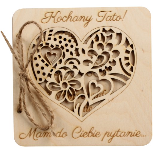 W środku drewnianej kartki znajduje się tekst: "TATO Czy poprowadzisz mnie do ołtarza?" oraz ozdobne serce.