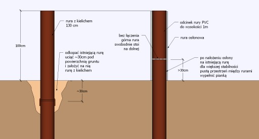 - Sposób 1 - Odkopać rurę, uciąć ją około 30cm pod powierzchnią gruntu i nałożyć na nią rurę z kielichem.