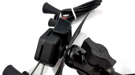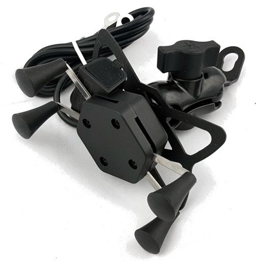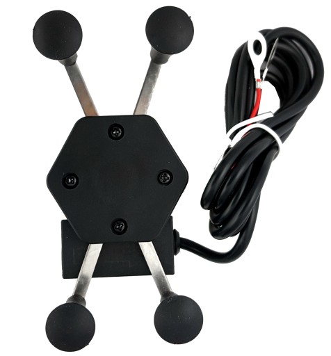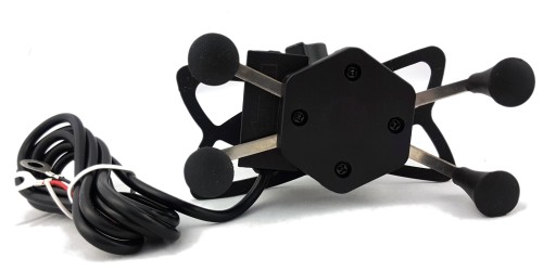 - Uchwyt typu X z 4 ramionami zakończonymi gumowymi chwytakami, ładowarką USB, włącznikiem i kablem