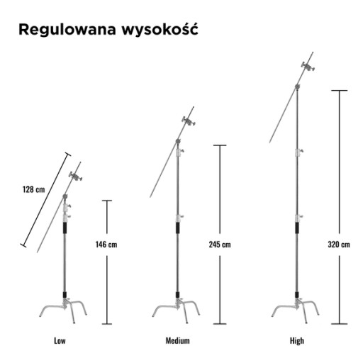 Cechą charakterystyczną dla statywu C-Stand PRO STUFF jest nie tylko jego wysoka jakość, ale także wygoda i komfort użytkowania. Na uwagę zasługuje tu przede wszystkim minimalna i maksymalna wysokość, która oscyluje w granicach 146-320 cm. Dzięki temu lampę można ustawić na dowolnej wysokość, w zależności od potrzeb.