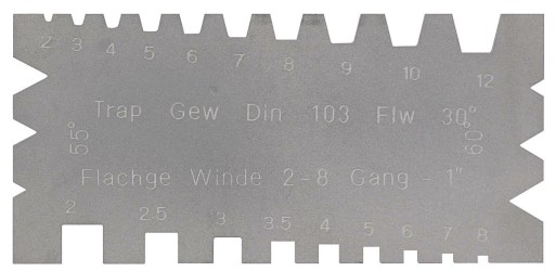 Uniwersalny. Do gwintów o zarysie trójkątnym (kąt gwintu), prostokątnym (zwojów na cal) i trapezowym 30° (skok).
