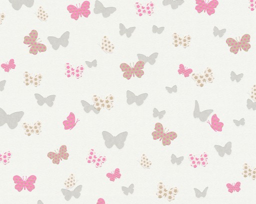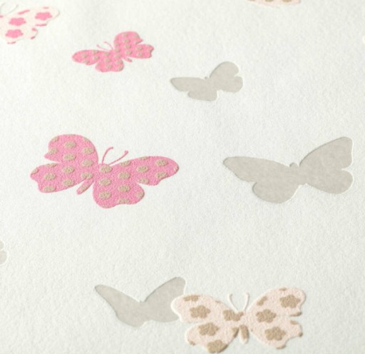 Tapeta na flizelinie niemieckiej firmy A.S. Creation z dziecięcej kolekcji Esprit Kids. Wzór to delikatne kolorowe motylki na białym tle.