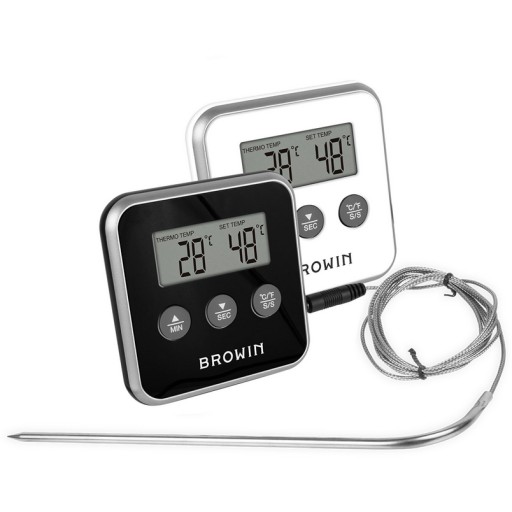 Przygotowywanie ulubionych potraw i kontrola ich temperatury jeszcze nigdy nie były takie proste! Termometr z sondą wykonaną ze stali nierdzewnej pozwoli Ci w prosty, szybki i precyzyjny sposób sprawdzić temperaturę zarówno podczas gotowania, wędzenia i pieczenia mięs, jak i przygotowywania innych potraw. Wymienna sonda termometru o długości ok. 18 cm, umieszczona jest na przewodzie o długości 1,5 m, co znacznie ułatwia dokonywanie pomiaru np. w głębokich piekarnikach czy wysokich naczyniach, bez obaw o poparzenie się gorącą potrawą. Termometr będzie również przydatny w procesie wędzenia, ze względu na sygnalizację temperatury zadanej w komorze wędzarniczej. Termometr posiada elektroniczny wyświetlacz i wyposażony jest w Timer umożliwiający ustawienie czasu do 99 minut i 59 sekund, a także temperatury od 0 do 250°C. Pomiar dokonywany może być w dwóch jednostkach: °C oraz °F. Atutem urządzenia jest również alarm sygnalizujący osiągnięcie ustawionej temperatury lub upływ czasu. Urządzenie posiada trzy opcje montażu: możliwość postawienia, zawieszenia lub przymocowania za pomocą magnesu.