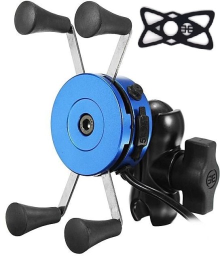 - Uchwyt typu X z 4 ramionami zakończonymi gumowymi chwytakami, ładowarką USB, włącznikiem i kablem