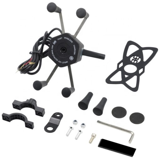 - Uchwyt typu X z 4 ramionami zakończonymi gumowymi chwytakami, ładowarka indukcyjną QI, ładowarką USB, włącznikiem i kablem