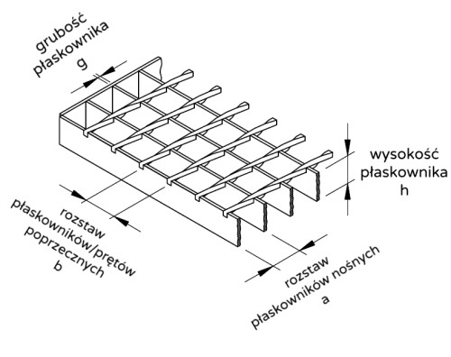 - minimalny rozstaw płaskowników/prętów poprzecznych (drugi wymiar w rozmiarze oczka): 22 mm – kraty wciskane lub 24 mm – kraty zgrzewane (b).