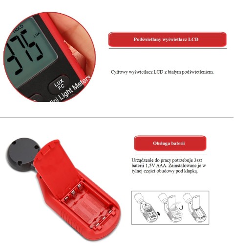 - pomiar natężenia oświetlenia (FC): 0 ~ 18,500 Fc