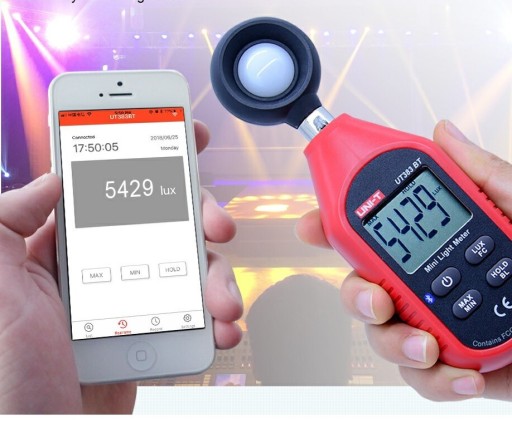 Luksomierz UT383BT sosowany do pomiaru natężenia światła na stanowiskach pracy oraz w miejscach użyteczności publicznej. Urządzenie wyposażone w bluetooth oraz aplikację iENV do pobrania ze sklepu Goole Paly lub App Store.