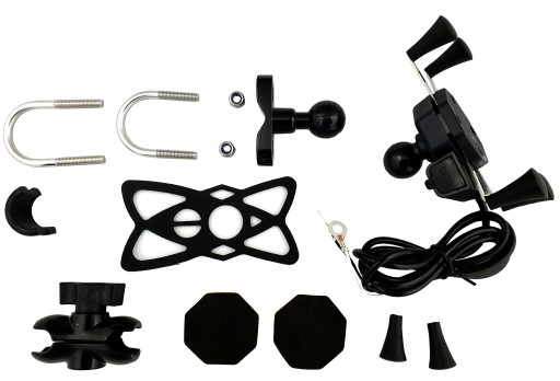 - 1x uchwyt typu X z 4 ramionami zakończonymi gumowymi chwytakami, ładowarką USB, włącznikiem i kablem